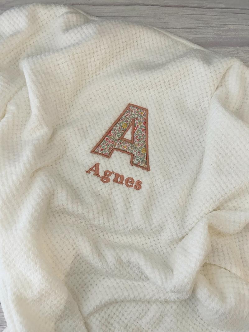 Personligt Babytæppe med Liberty Stof og Navn er en uundgåelig del af dit barns udstyr. Tæppet er lavet af blødt. Økologisk materiale og har et broderet bogstav og barnets navn i det velkendte Liberty stof.